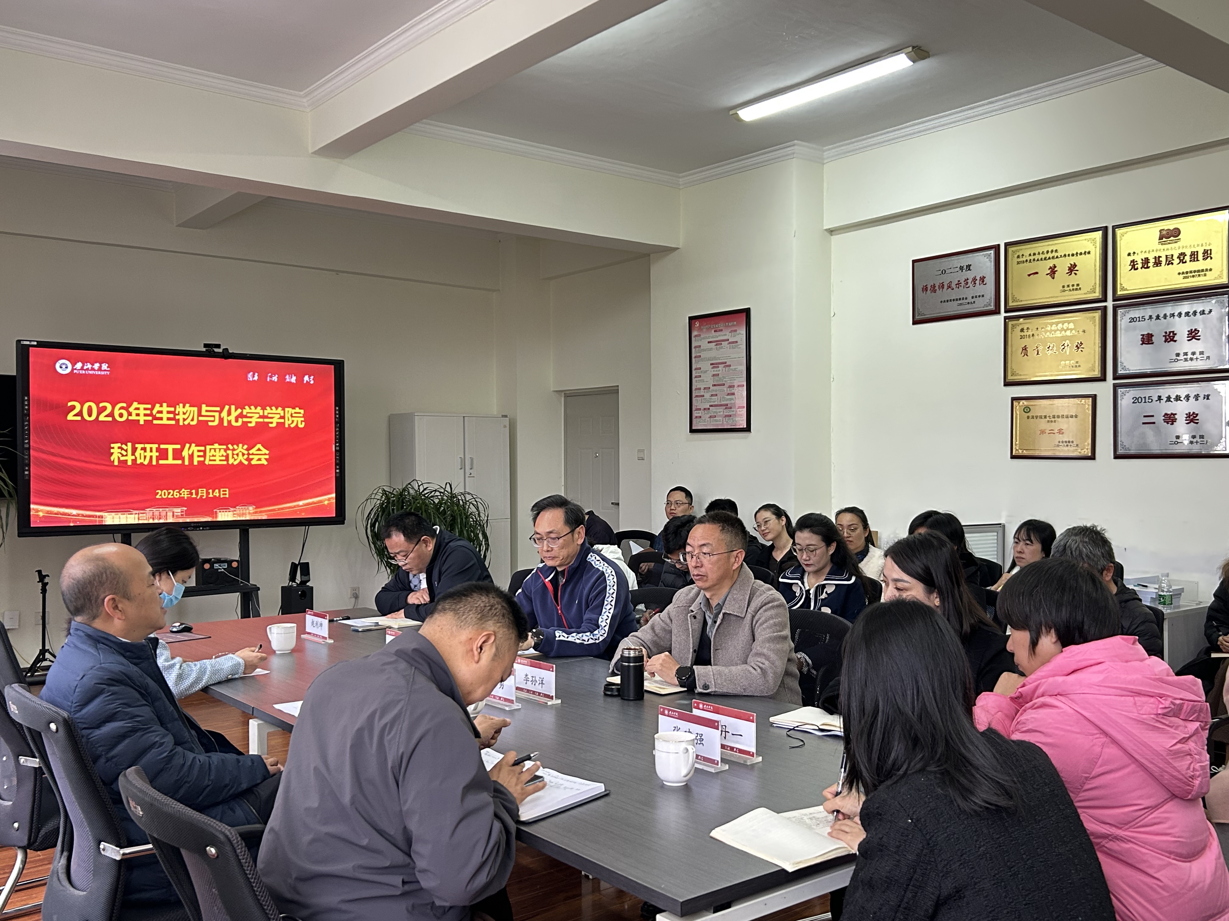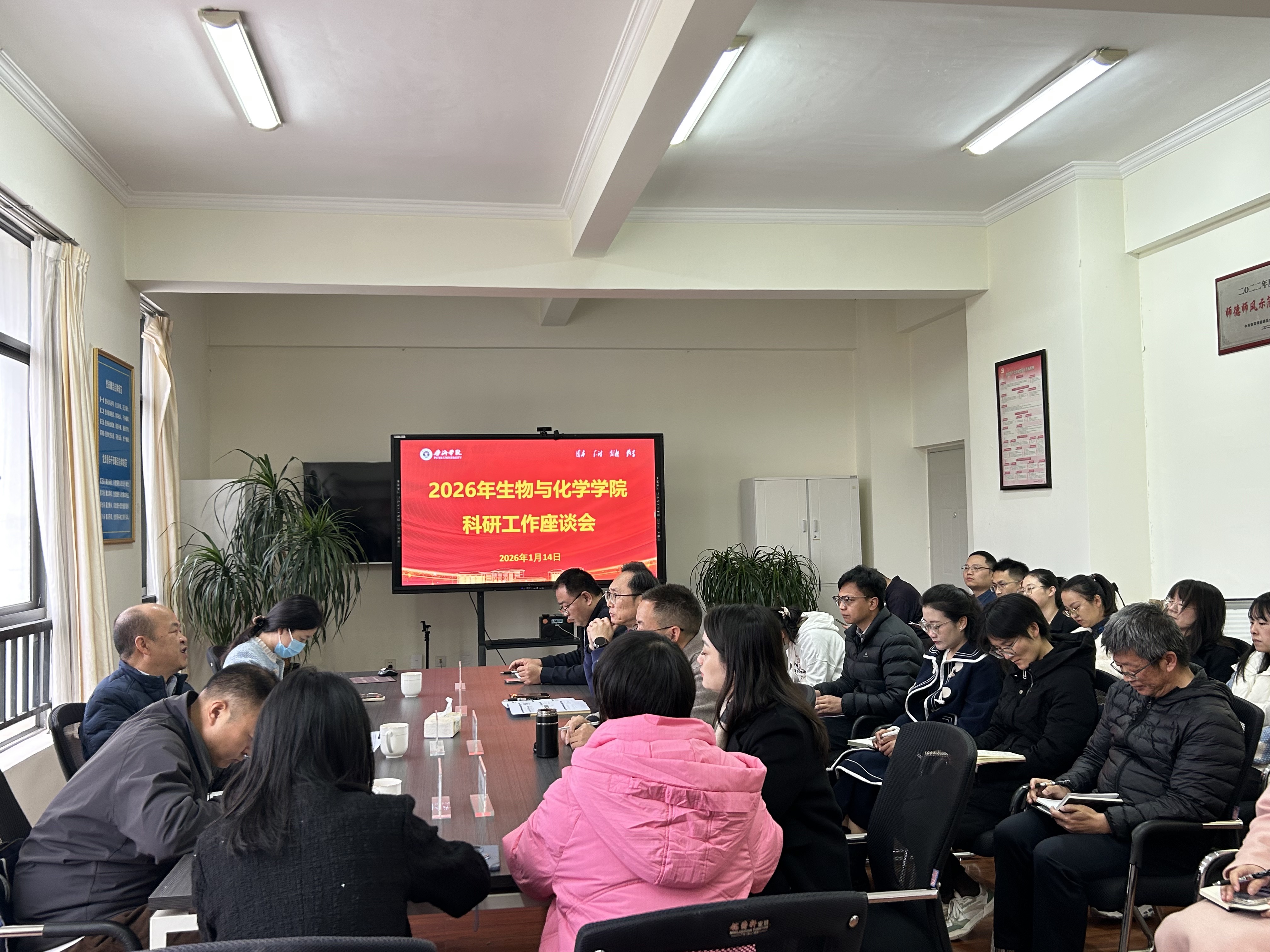 2026年1月14日,生物与化学学院召开2026年度科研工作座谈会,全面总结2025年学院科研工作成效,深入剖析当前科研工作存在的不足与短板,精准谋划“十五五”开局之年科研工作思路及推进举措。学校副校长陈勇到会指导,学院党总支书记李孙洋出席会议,党总支副书记、刘院长主持会议,全体教职工参加会议。